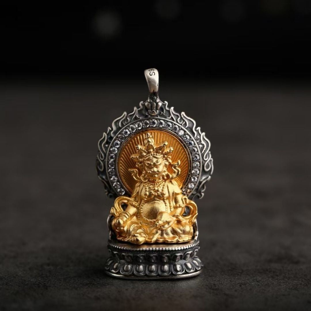 Jewelry featuring Yellow Jambhala often captures his joyful and benevolent essence. The pendants or charms are typically crafted from metals like gold, brass, or copper, which amplify his connection to wealth. The craftsmanship details are striking—from the intricate patterns on his robes to the playful warmth in his expression. Some pieces may also incorporate additional symbols of prosperity, such as coins or treasure vases.