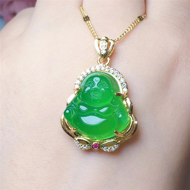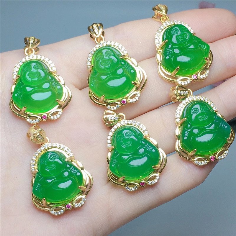 Buddha jewelry:High-ice Inlaid Green Chalcedony Buddha Pendant, Green Agate Maitreya Buddha Jade Pendant