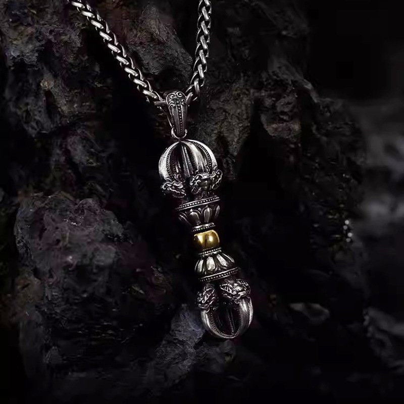 This vintage-style vajra pestle pendant is made of copper-plated silver material. The copper provides a stable base for the pendant, and the silver plating on the outer layer gives it a silver-like luster and texture, while exuding an ancient and timeless charm. It is often deliberately oxidized or polished to form an appearance that looks like it has gone through years, enhancing the necklace’s vintage appeal, as if it has been passed down and cherished from generation to generation. This distressed surface treatment not only endows the pendant with a unique personality but also highlights the fine details of the vajra design – from the ridges on the prongs to the decorative patterns carved on the central shaft. These patterns may include sacred symbols such as lotus flowers, mantras, or geometric figures, each containing additional spiritual meanings.